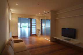 A estratégia de projeto proporcionou uma relação de continuidade com o espaço externo, através da presença do jardim e dos grandes panos de vidros que constituem a fachada. A intenção de um espaço convidativo e acolhedor foi materializada com o uso da madeira tropical como principal elemento de composição do ambiente, e sua aplicação se deu nas paredes, forros e móveis. Estes últimos desenhamos com o intuito de proporcionar maior identidade ao projeto.