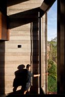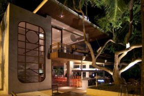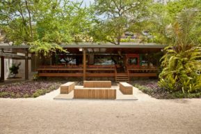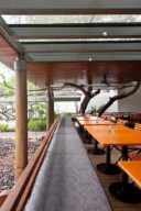 As árvores existentes no espaço de implantação da varanda foram preservadas, e seus troncos atravessam a cobertura por meio de furos deixados na estrutura.