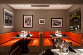 A fachada de acesso ao restaurante é marcada pelo jogo de planos e geometrização das aberturas. Ainda na entrada estão em destaque esculturas do artista Bel Borba que valorizam a identidade característica da culinária do Soho.