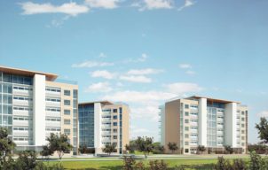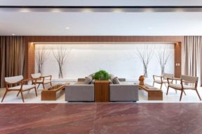 O projeto conta com três lojas no térreo, mais portaria e saguão do residencial. São ao todo 90 apartamentos, do 1º ao 7º, sendo 4 unidades duplex, com acesso à cobertura.