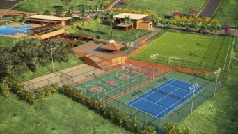 Os projetos desenvolvidos pelo escritório para as áreas comuns do Condomínio Terras da Lagoa contemplam: portaria, áreas de lazer, praças, clube com piscinas, quadras, parque infantil e salão de festas, além de um Centro Equestre com quarenta baías para cavalos, totalizando aproximadamente 3.000m².