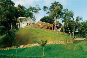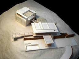 O projeto foi pensado para integrar-se a paisagem, como dois blocos monolíticos que afloram do morro. A utilização do concreto armado aparente, madeira e pedras da região evocam um caráter mais natural, apesar do arrojo estrutural da proposta.