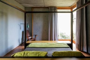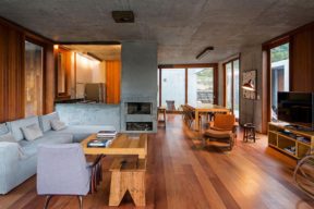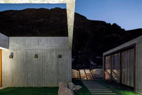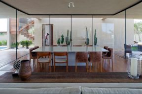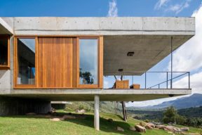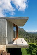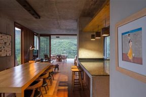 Ainda no térreo, há um jogo de tensões entre dois volumes que se voltam para o mar com uma lâmina de concreto que os conecta. Duas vigas invertidas de concreto armado, com 75 cm altura, atirantam a laje que define a sala de jantar e o deck de madeira. Além de proporcionar um espaço sem a interferência de pilares, a laje promove a conexão entre os dormitórios dos moradores com o pavilhão de hóspedes.