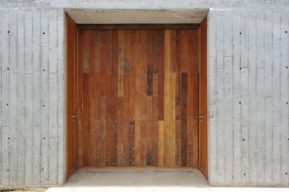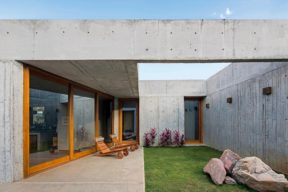 Uma caixa vazada de concreto marca o acesso ao setor público da casa, sendo o primeiro dos quatro volumes identificados pelo usuário. Com uma laje de 60m², e apoios apenas nas extremidades, promove-se sombra a varanda e ao espaço gourmet. Nesta caixa ainda se desenvolve a cozinha e a área de serviço, além do acesso ao subsolo.
