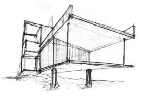 A varanda possui laje em concreto armado aparente com 15 cm de altura, atirantada por cabos metálicos na viga de concreto da cobertura. A varanda projeta-se sobre o terreno, no sentido contrário das curvas de nível, com um balanço de 5.25 m.