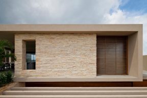 Sua materialidade é constituída por poucos elementos e com tonalidades neutras, a exemplo da textura cinza aplicada nas paredes e do revestimento em filetes de pedra São Tomé e na textura cinza que foram aplicadas nas áreas externas da edificação.
