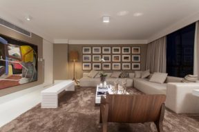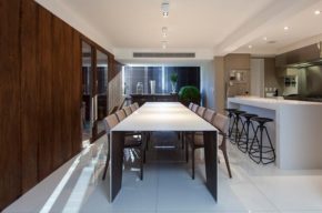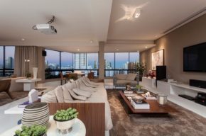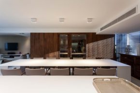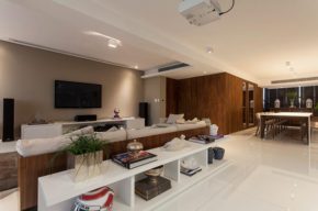 O apartamento de 260,00 m² , que inicialmente possuía 4 suítes, teve um dos cômodos demolidos para ampliação da sala de estar, integrada com a varanda. O jantar se conecta com a cozinha gourmet, que tem vista privilegiada para toda sala de estar e adega. A parede da adega e lavabo é revestido em madeira. A obra conta com pisos em Marmoglass de 1.20 x 1.20 m, paredes em madeira e pintura, forro em gesso acartonado e bancadas em Corian.